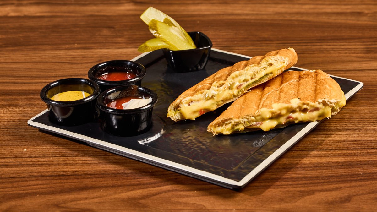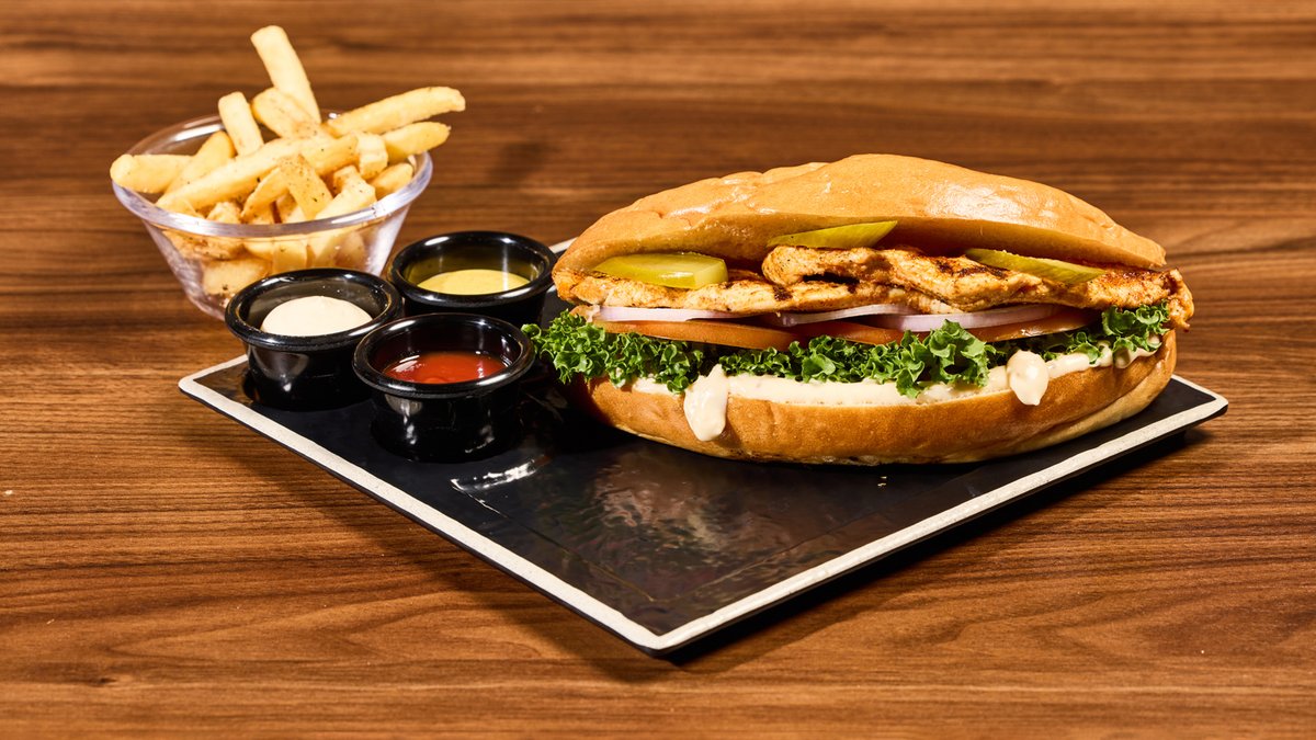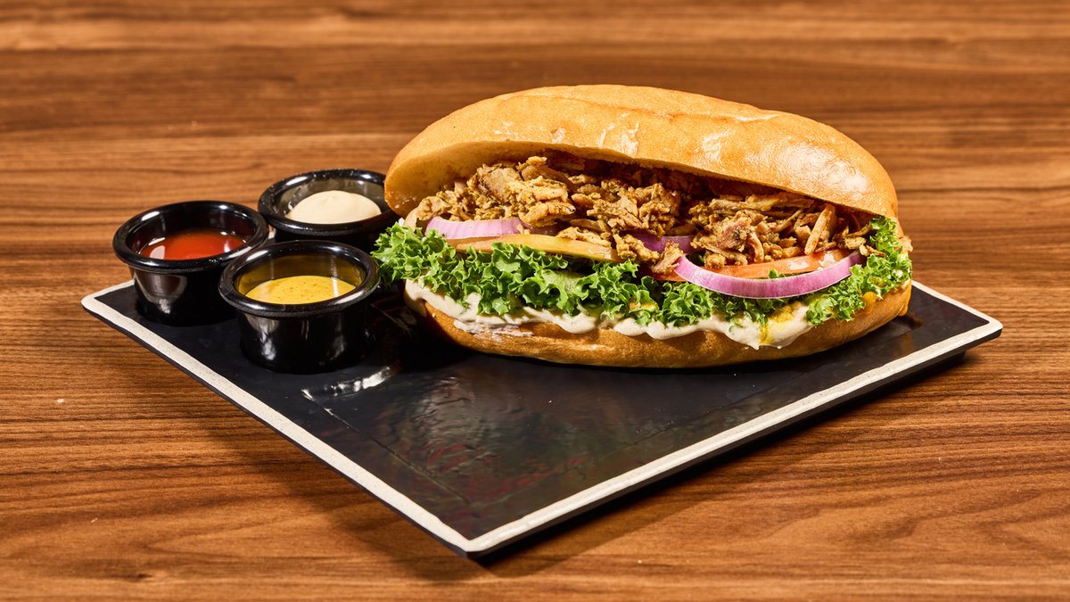 שניצל בג׳בטה קריספית עם רוטב בפאלו, חסה, עגבניה, בצל סגול ומלפפון חמוץ מוגש עם צ׳יפס וקומבינציה של רטבי הבית