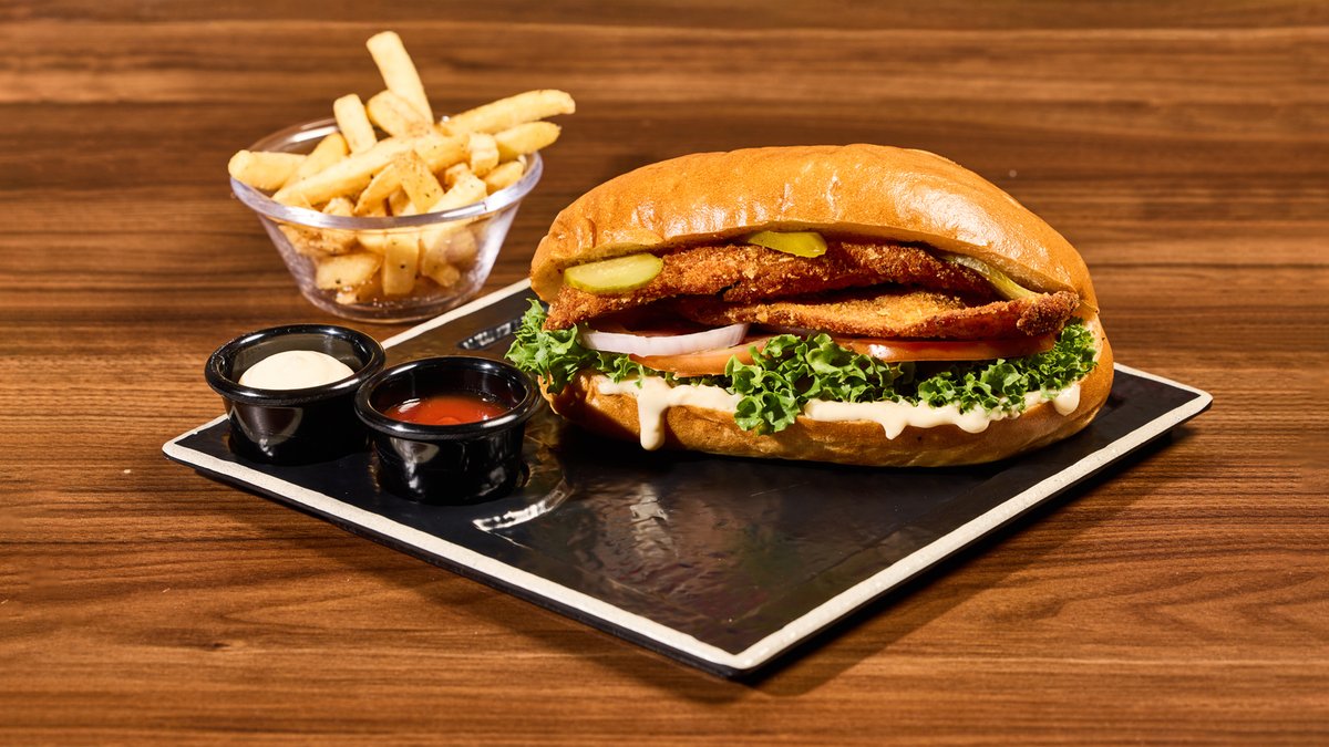 קציצה פריכה של פילה דג בלחמניה עם רוטב איולי לימון , חסה ומלפפון חמוץ מוגש עם צ׳יפס ורטבים מיונז-קטשופ-אלף האים