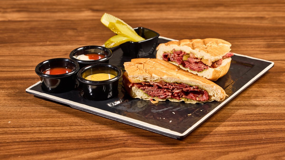רוטב ניו יורק, בצל סגול, חסה, עגבניה, מלפפון חמוץ וגבינת צ׳דר | בחרו משקל מוגש עם צ׳יפס ורטבים מיונז-קטשופ-אלף האיים.