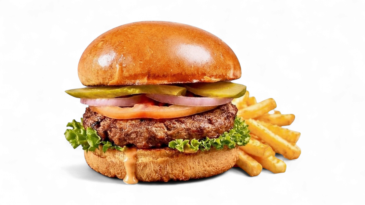 קצצת בשר טרי ,רוטב ניו יורק, בצל סגול, חסה, עגבניה ומלפפון חמוץ | בחרו משקל מוגש עם צ׳יפס ורטבים