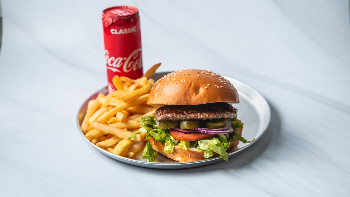 קציצה מחלבון אפונה עם חסה, בצל סגול ומלפפון חמוץ מוגש עם צ׳יפס, 2 קטשופ, 2 מיונז ושתיה לבחירה