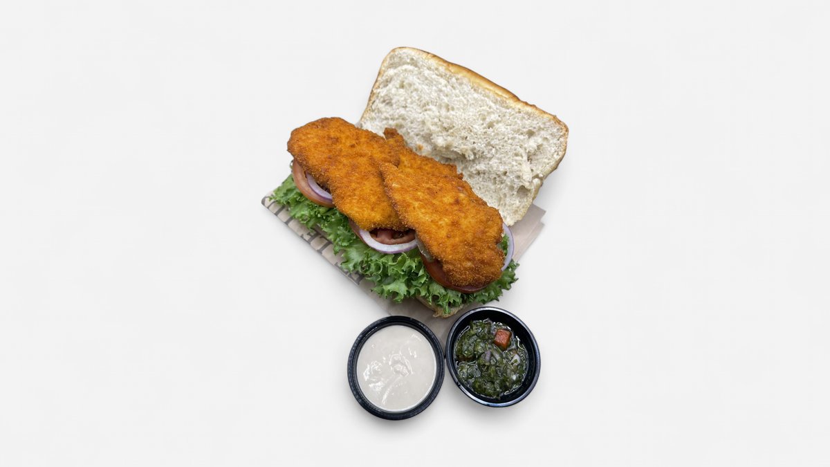 חזה עוף מצופה בפירורי לחם, חסה, עגבניה, בצל סגול, מלפפון חמוץ, צ׳ימיצ׳ורי ורוטב שום