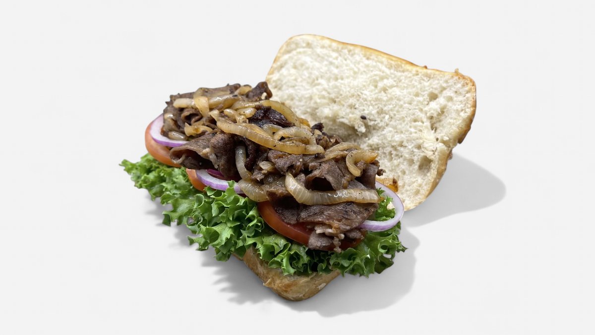 רצועות אנטריקוט, בצל מטוגן, חסה, עגבניה, בצל סגול, מלפפון חמוץ, צ׳ימיצ׳ורי ורוטב שום