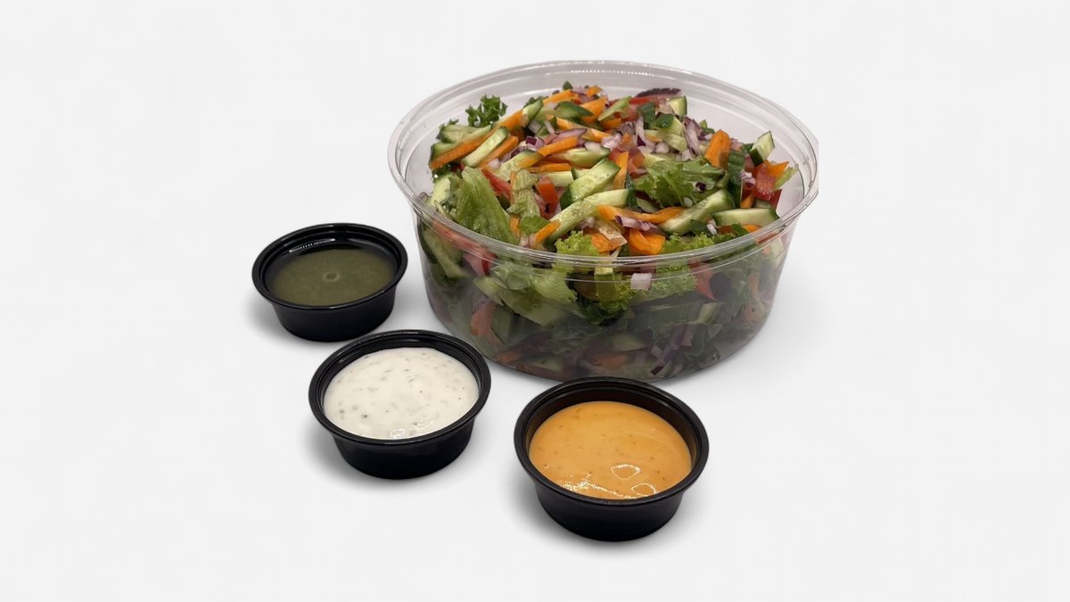חסה, עגבניה,בצל סגול ומלפפון חמוץ מוגש לצד 2 קטשופ, 2 מיונז בצד