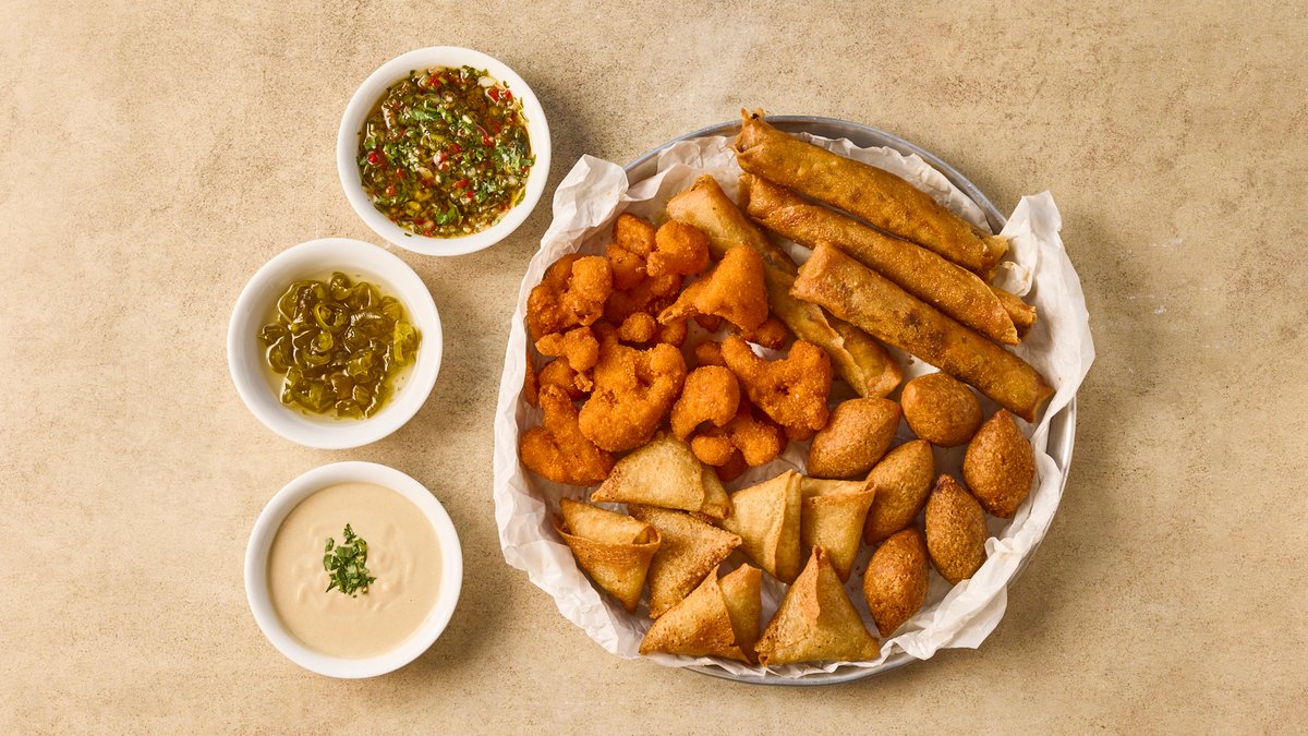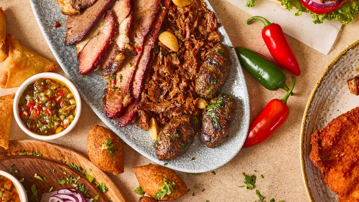 סיגר בשר פיקנטי, קובה בורגול, סיגר פריקי עדשים ופסטל תפו"א מוגש עם צ'ימיצ'ורי, טחינה וריבת חלפיניו