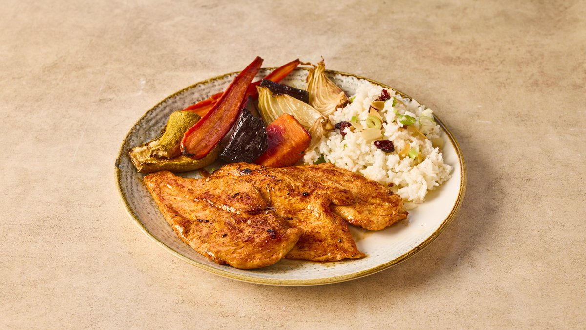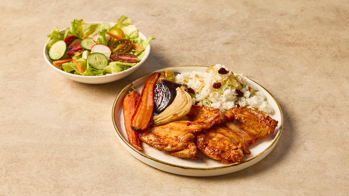 חזה עוף מתובל צלוי על הגריל מוגש עם תוספת וסלט לבחירה