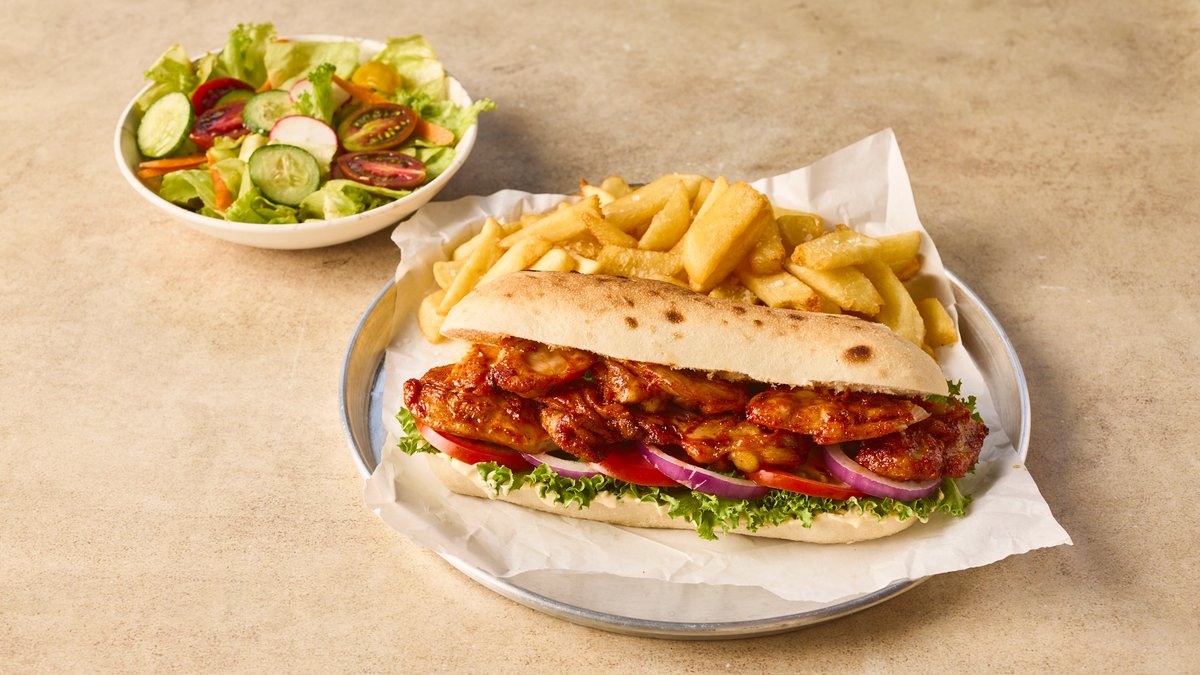 כריך סטייק פרגית בתיבול ים תיכוני צלוי בגריל פחמים מוגש עם תוספת וסלט לבחירה