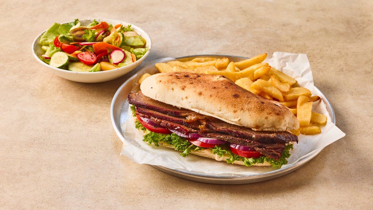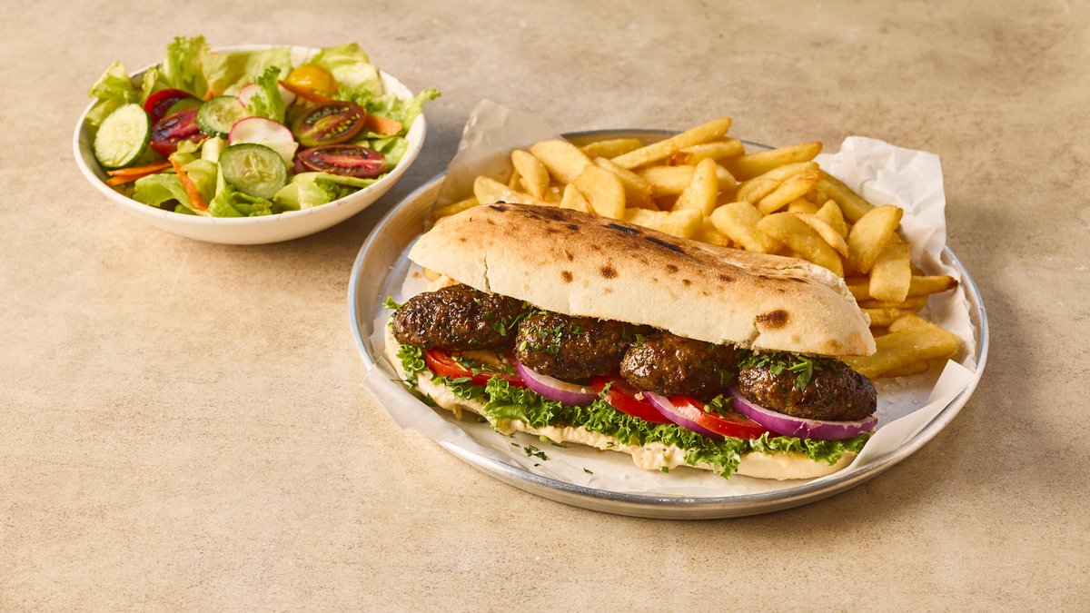 כריך קבב טלה צלוי בגריל פחמים מוגש עם תוספת וסלט לבחירה