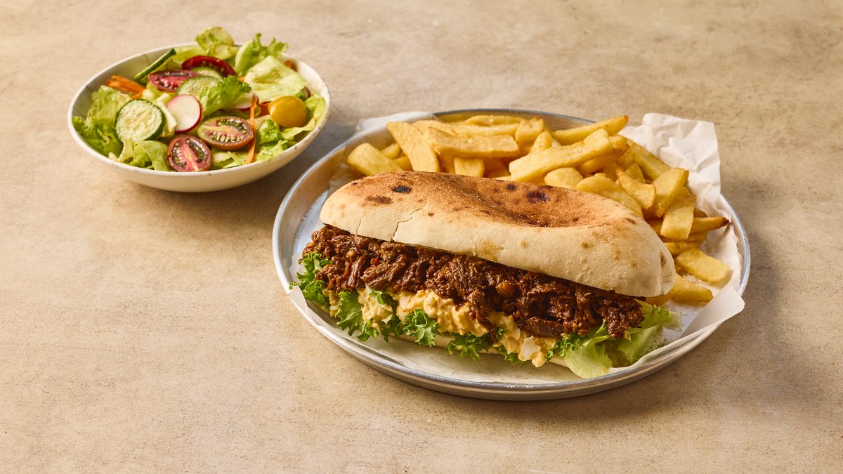 אונטריב מפורק בעישון ארוך עם חסה, בצל מוקפץ, איולי, צ’ימיצ’ורי, קונפי שום, חסה, בצל, עגבניה ומלפפון חמוץ בלחמניה הנאפת במקום מוגש עם תוספת וסלט לבחירה