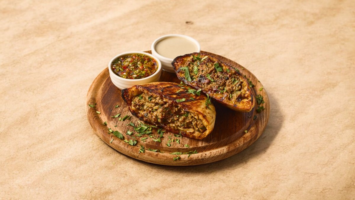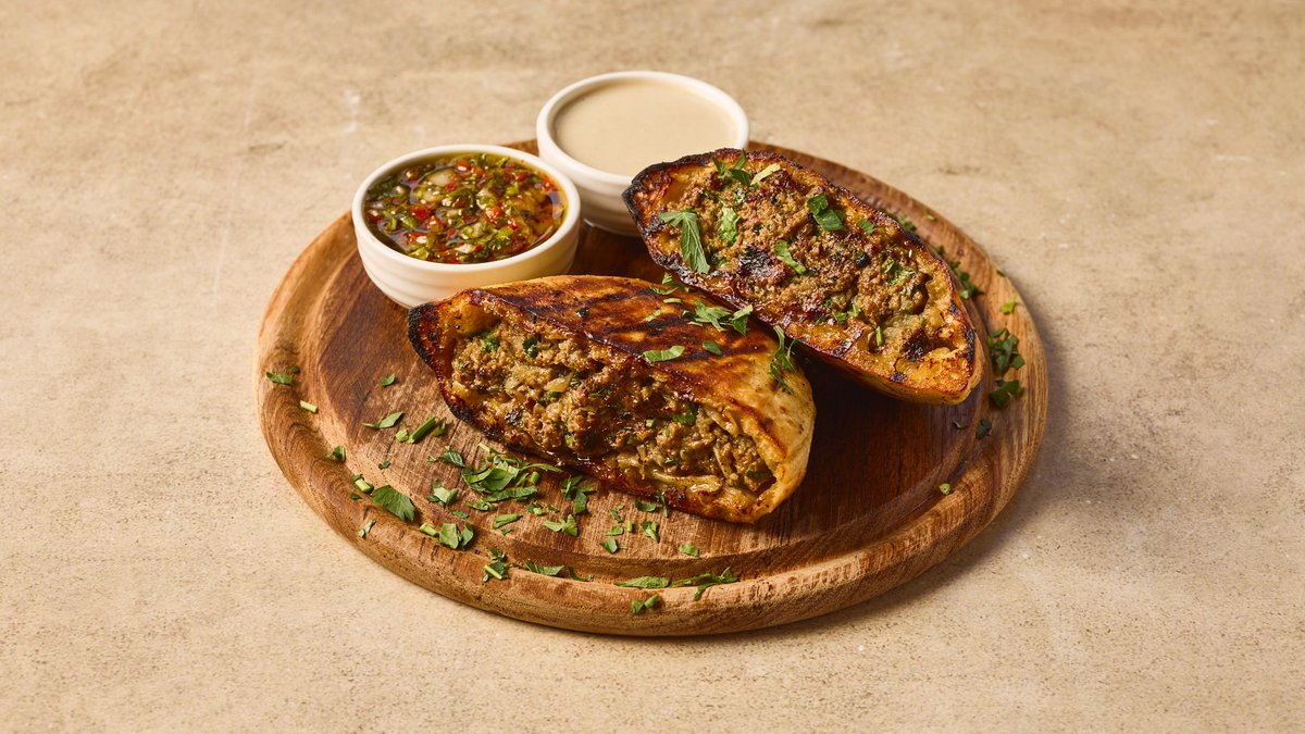 2 חצאי פיתה עם בשר טלה מתובל ועסיסי מוגש עם טחינה הר-ברכה וצ'ימיצ'ורי הום מייד
