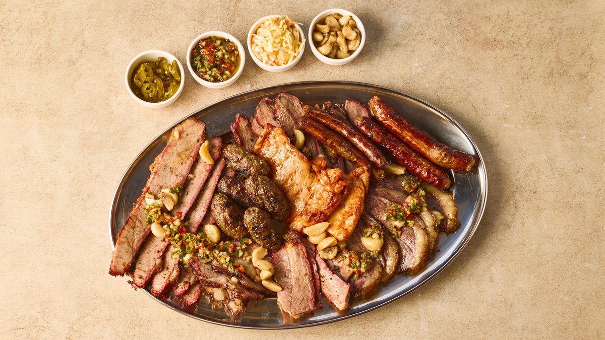 500 גר׳ בשרים בהגריל והמעשנה: בריסקט, פרגית, צ'וריסוס, קבב, כנפיים, מרגז. מוגש עם הום פרייז שום ועשבי תיבול, סלט קולסלואו, צ'ימיצ'ורי, טחינה וריבת חלפיני