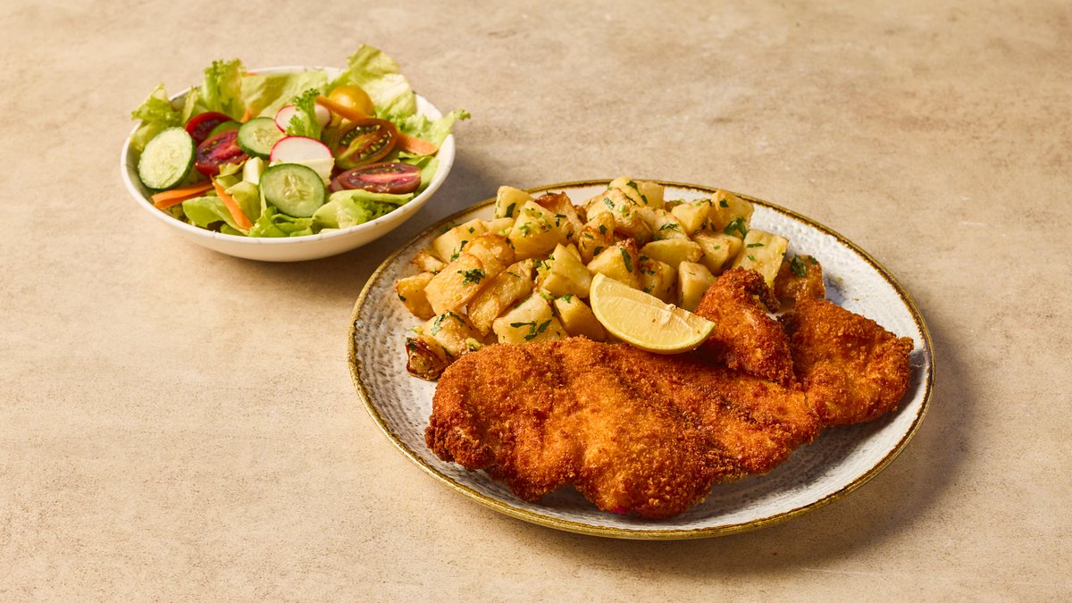 שניצל עוף פריך ומוזהב, מוכן בציפוי פירורי לחם איכותי