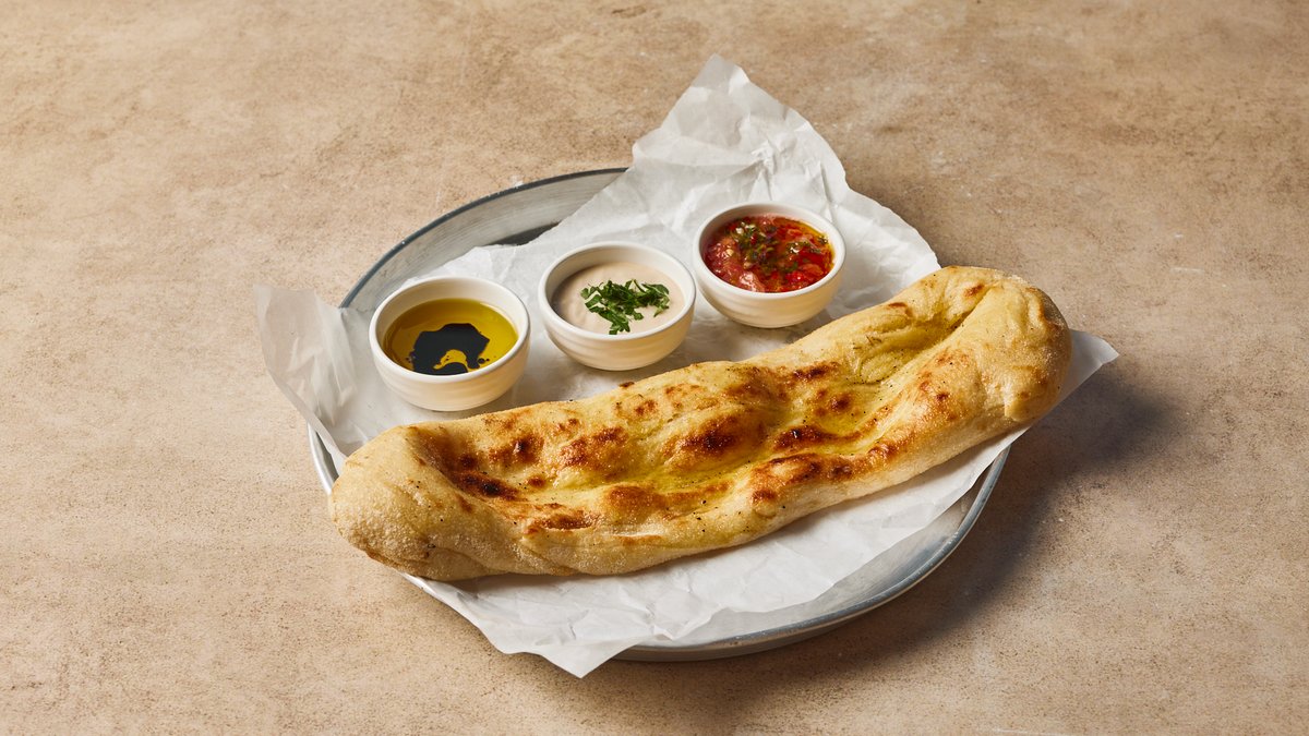 פוקצ׳ה חמה עם שלושה מטבלים: שמן זית בלסמי, טחינה וסלסת עגבניות