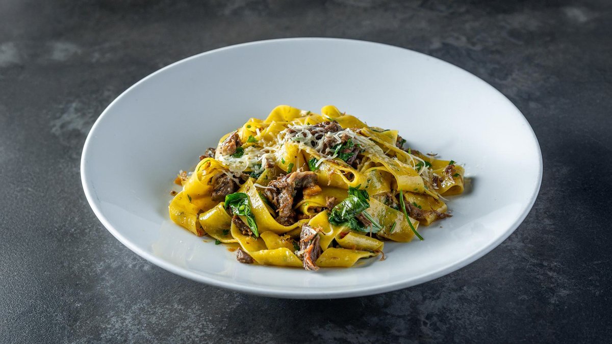 פטוצ׳יני עם נתחי סינטה, עגבניות שרי ובצל סגול מושחם ברוטב שום שמן זית ועשבי תיבול ("כשר")
