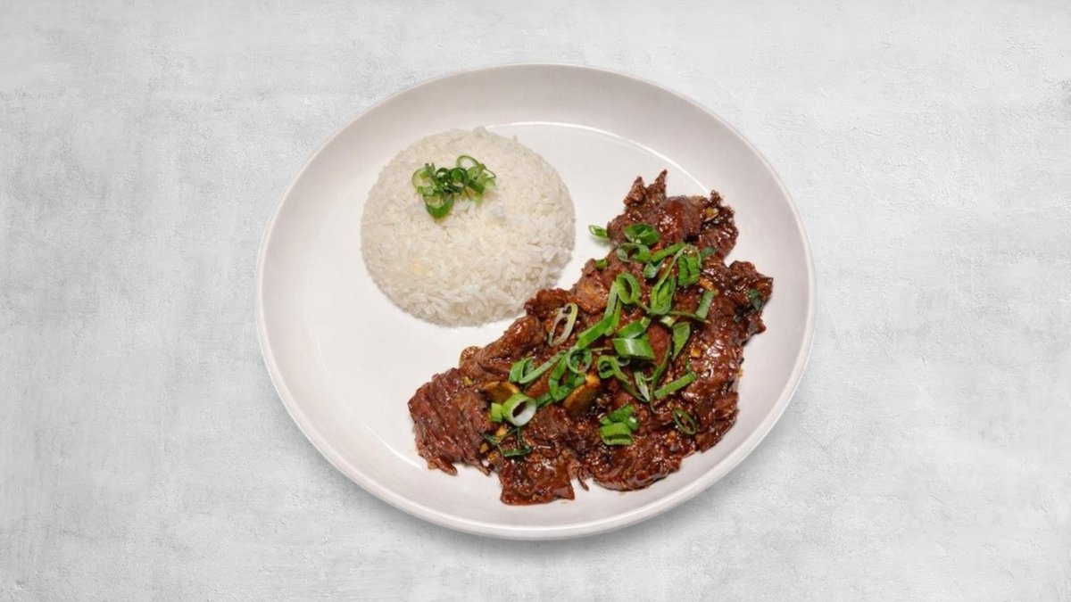 240 גרם של רצועות סינטה מוקפצות עם פטריות ובצל ברוטב של סויה, דבש וג'ינג'ר מוגש עם תוספת אורז בצד ובצל ירוק.