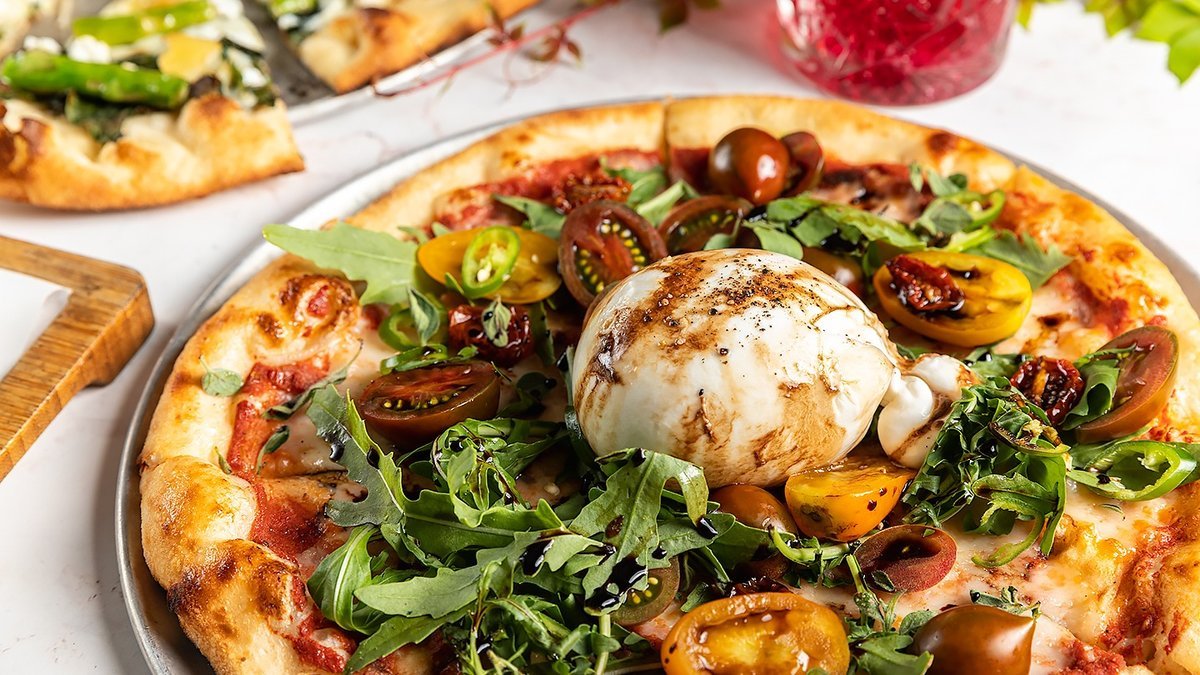 רוטב עגבניות, מוצרלה, שאלוט קונפי, בצלים מקורמלים ביין אדום ובלסמי, בצל ירוק, בצל סגול וגבינה כחולה