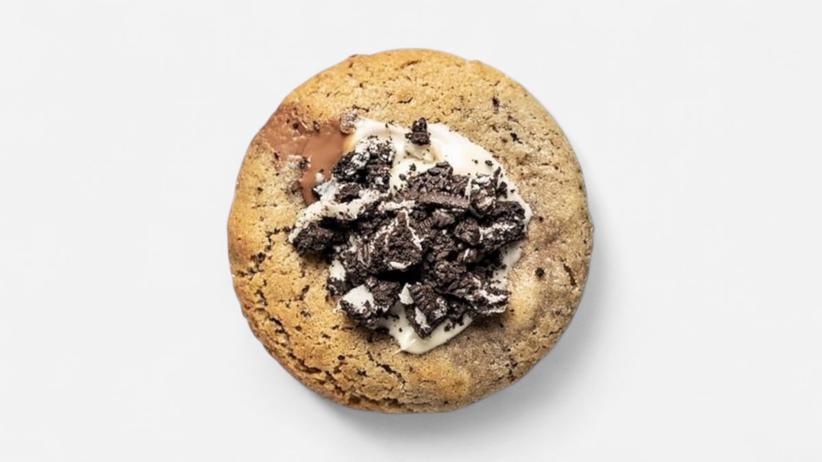 עוגייה עשירה בחתיכות אוריאו, שוקולד מריר ולבן, עם לב נמס של שוקולד חלב.
