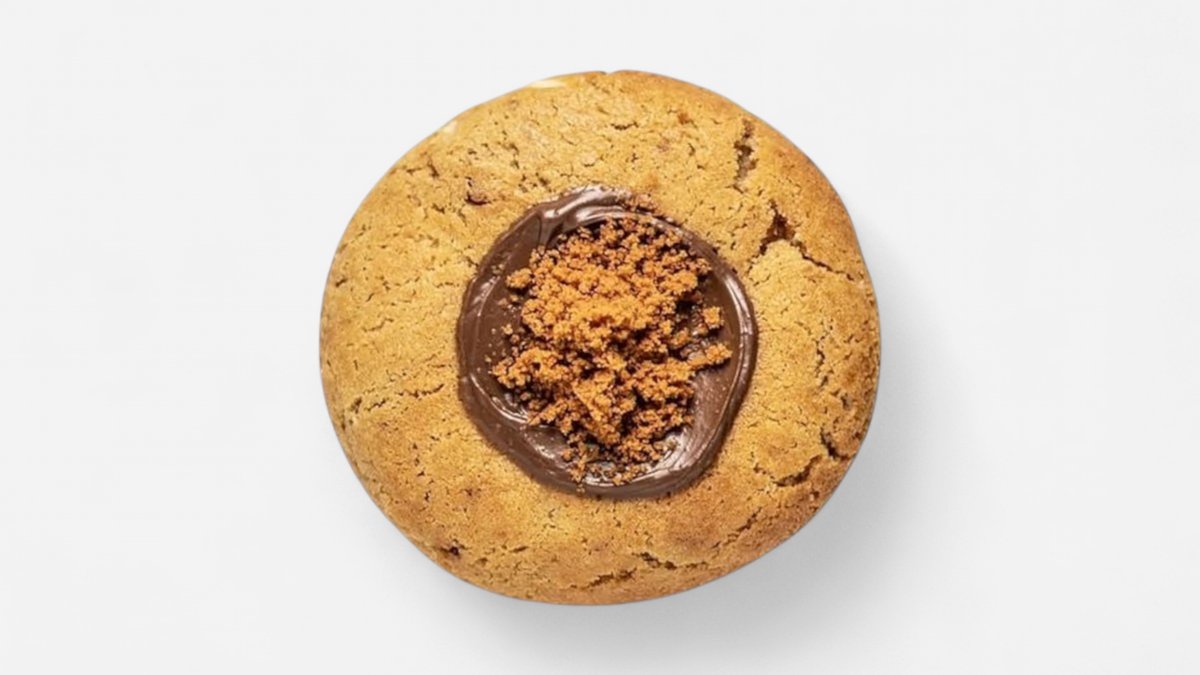 עוגייה בהירה ורכה עם שוקוצ'יפס מריר, ממולאת בקרם פיסטוק, שוקולד חלב וקראנץ' ממכר.