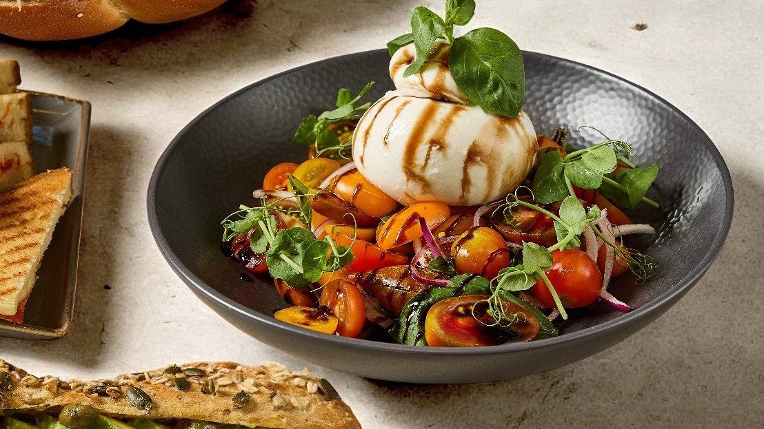תערובת חסות, עגבניות שרי, זיתי קלמטה, בצל סגול, בזיליקום, מוצרלה קרועה, תפוז, אגוזי מלך ובלסמי מצומצם