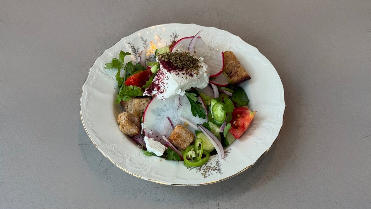 סלט ירקות עונה ופלפל חריף, לחם קלוי, גבינה בולגרית, סומק וזעתר