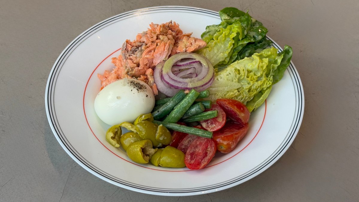 ביצה רכה, פורל, תפוחי אדמה מבושלים, שעועית ירוקה, חסה, עגבניה, מלפפון בתיבול שמן זית לימון