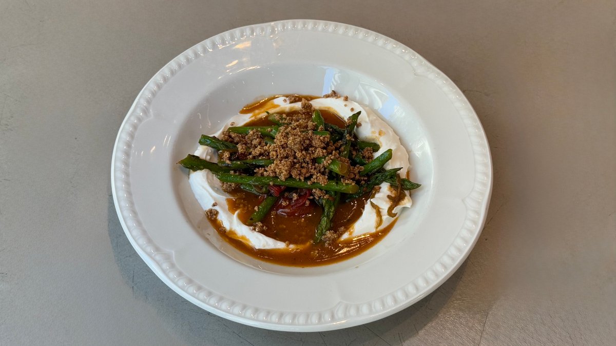 תבשיל אספרגוס קצר, עגבניות לחות, מרווה, יין לבן, לאבנה ודואה