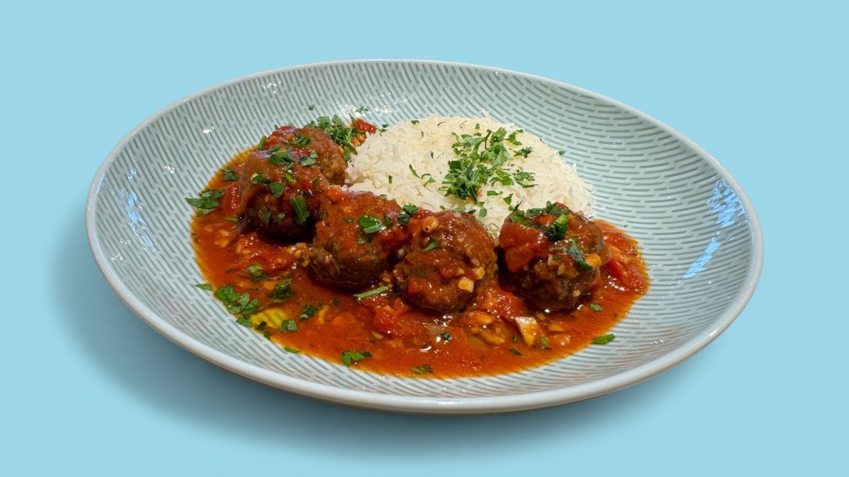 קציצות בקר מבושלות ברוטב עגבניות עם שום ואורגנו, מוגשות עם אורז לבן