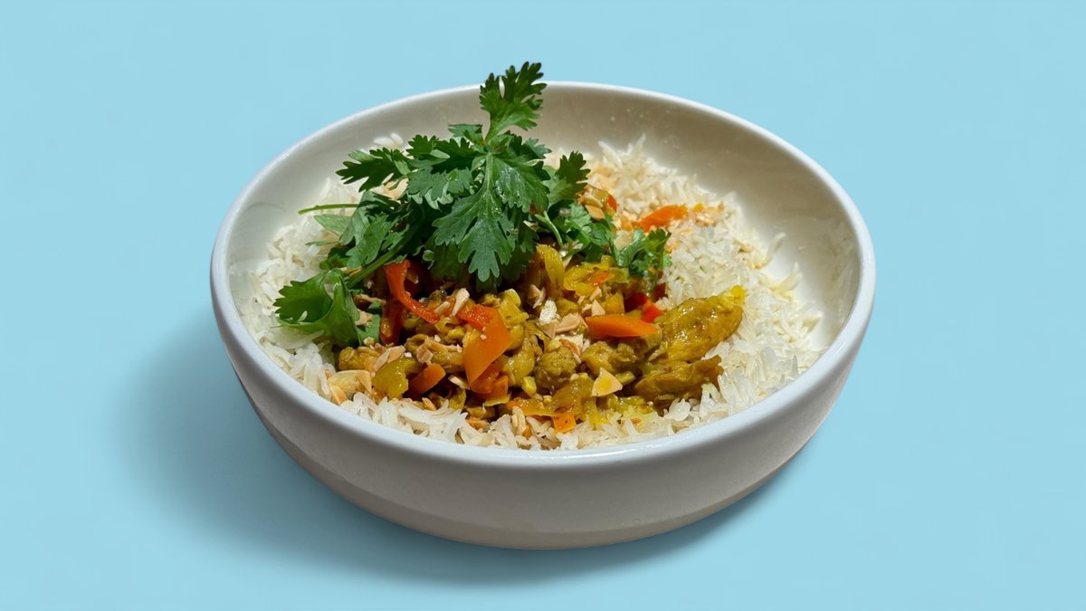 תבשיל קארי צהוב עם נתחי פרגית וירקות, מוגש על אורז בסמטי עם בוטנים קלויים וכוסברה