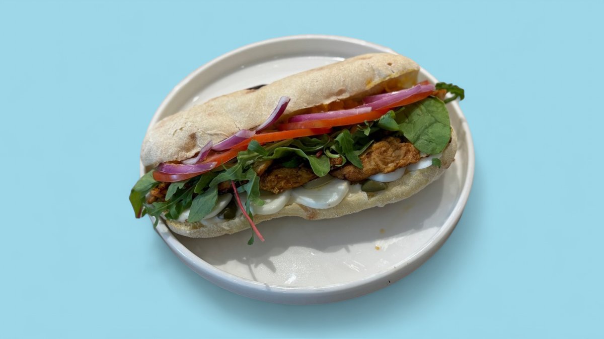 כריך חזה עוף חמים בלחמנית פרנה עם ביצה קשה, צלפים, רוקט, עגבניות, בצל סגול ואיולי לימונים כבושים