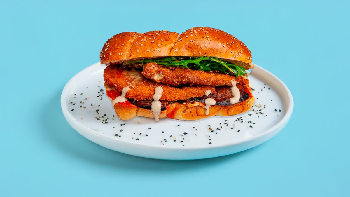 שניצל בחלה עם מטבוחה, מלפפון חמוץ, רוקט וטחינה