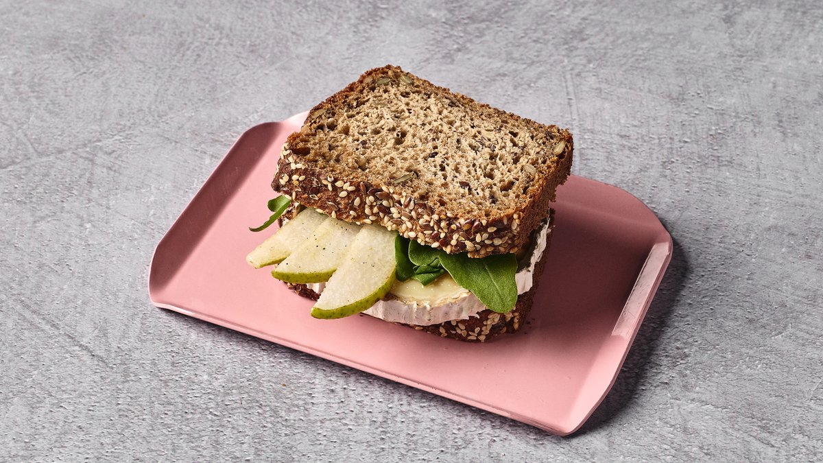 גבינת בושה, ריבת בצל, אגס וארוגולה בלחם נלסון