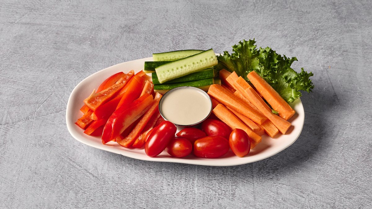 מלפפון, גמבה, עגבניות שרי וגזר מוגש בכוס עם טחינה
