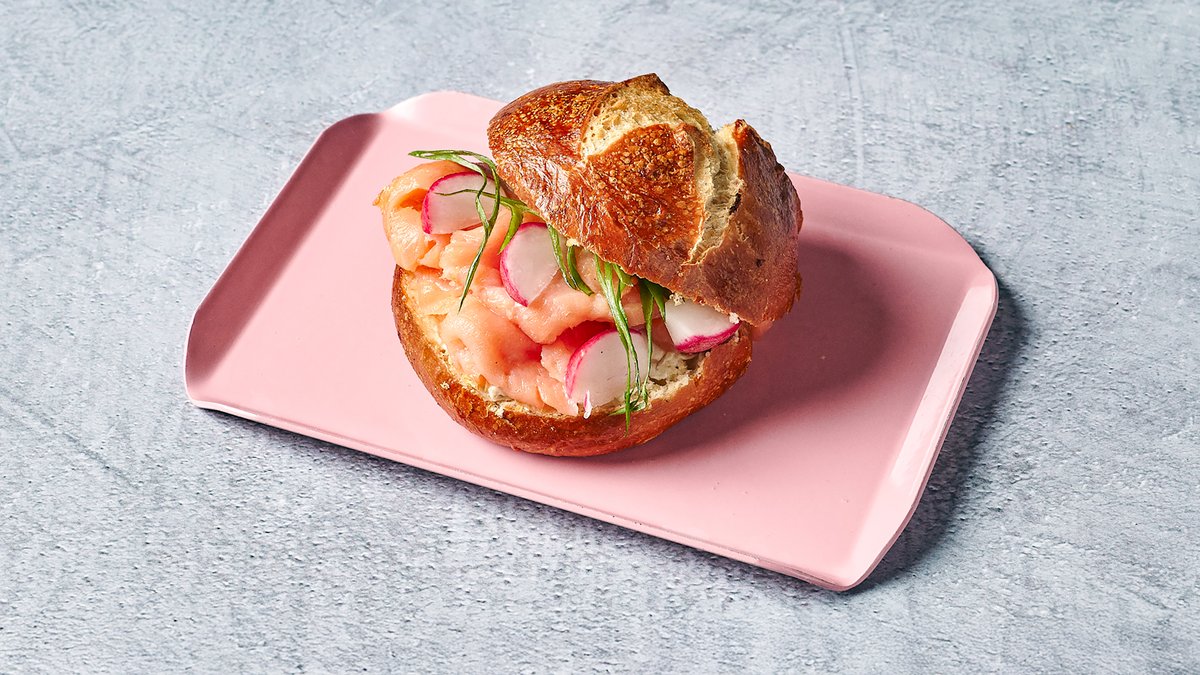 גבינת שמנת, סלמון מעושן, צנונית, פלפל צ'ילי, צנונית, גרידת לימון, בצל ירוק מוגש בביס פרצל