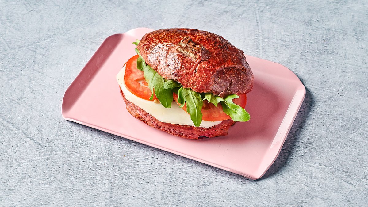 גבינת ברי צרפתי, פקאן, סלק, גבינת שמנת, עלי בייבי בשמן זית ובלסמי מצומצם בלחמניית פרג