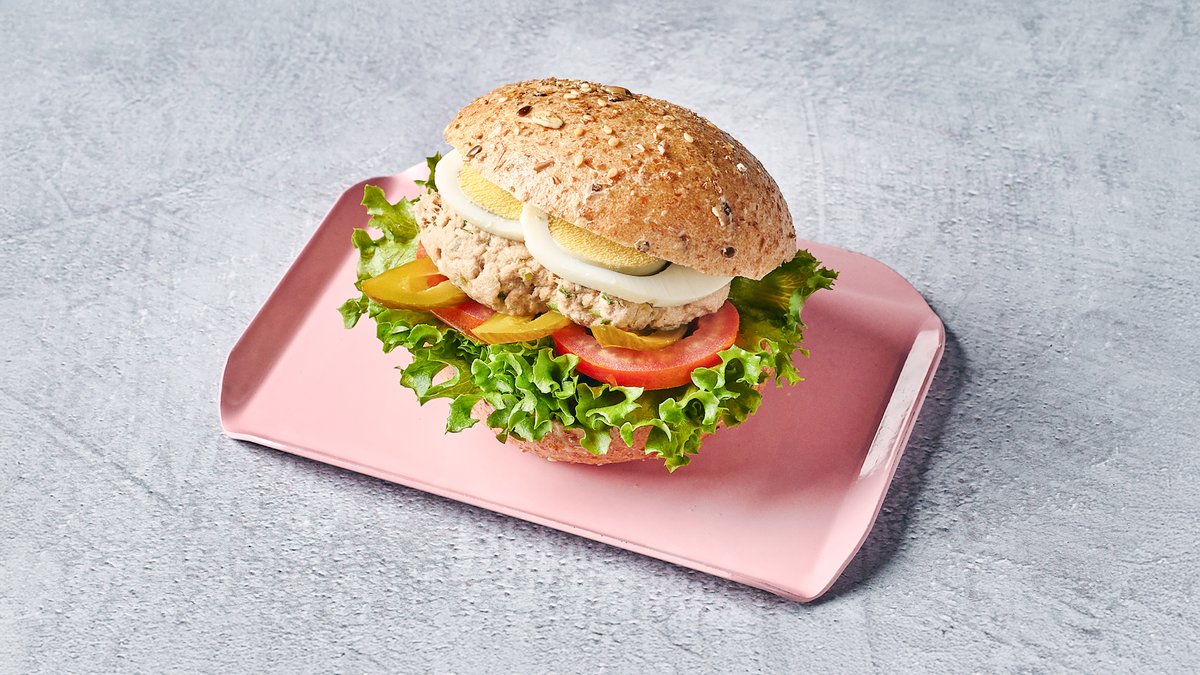 סלט טונה אמריקאי, ביצה קשה, מלפפון חמוץ, עגבנייה מוגש בביס דגנים