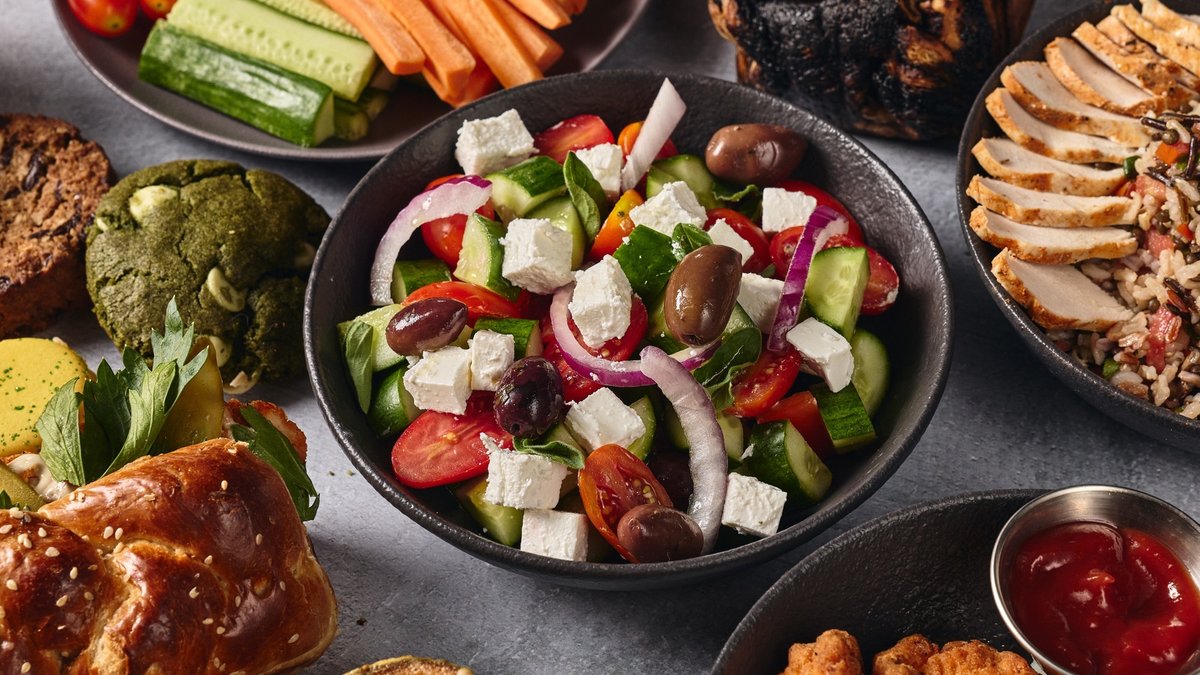 מלפפון, שרי, זיתי קלמטה, אורגנו, פטה, בצל סגול מוגש עם רוטב שמן זית לימון