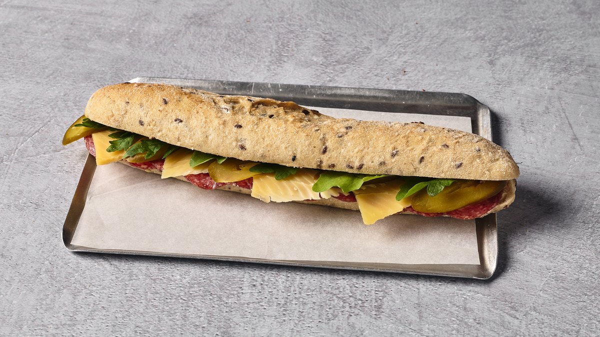חמאת פורצ'יני, סלמי, ארטישוק, חרדל וארוגולה מוגש בבגט דגנים