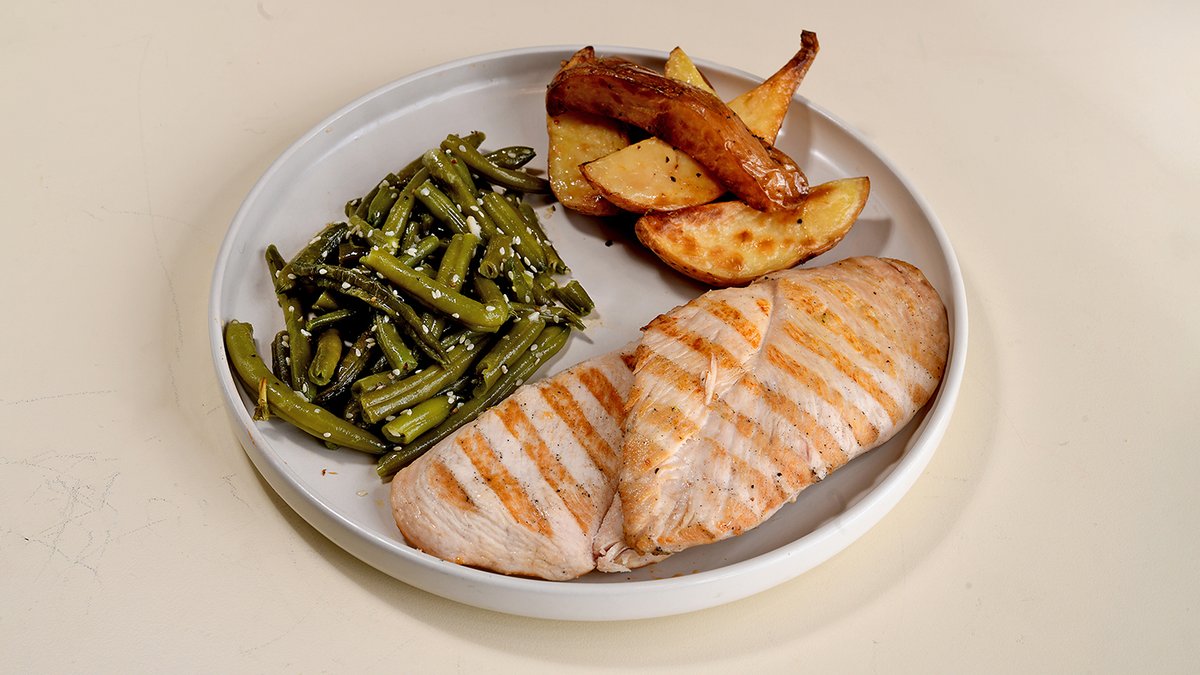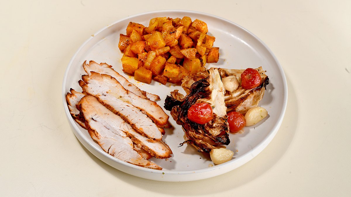 חזה הודו צלוי ופרוס מוגש עם 2 תוספות לבחירה