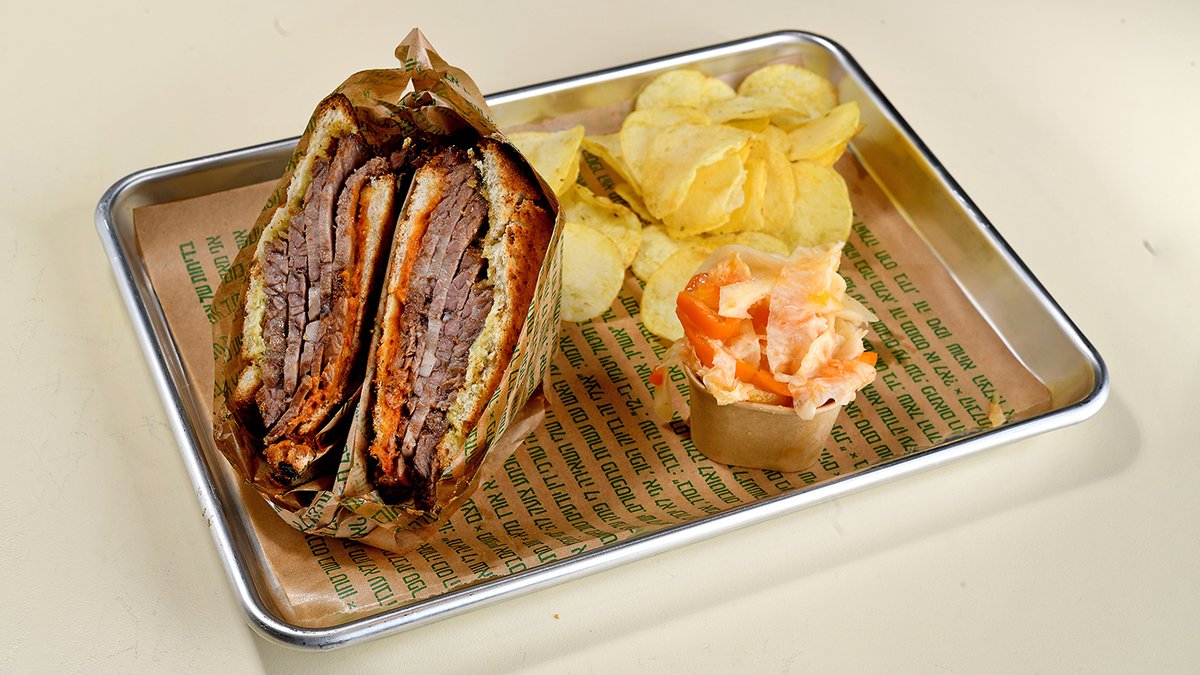 200 גרם בריסקט בבישול ארוך עם רטבי הבית בלחם רך מוגש עם חמוצים