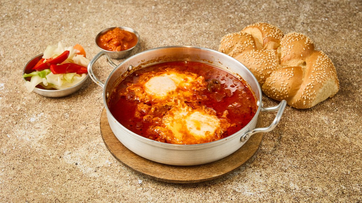 שקשוקה עם שתי ביצים ברוטב טריפוליטאי אסלי מוגש עם חלה מתוקה ומטבלים