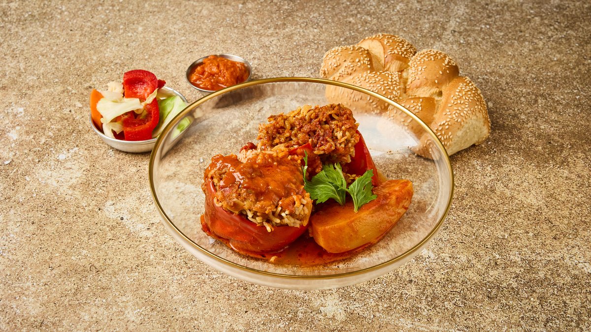 פלפל ממולא בשר, אורז וירק מוגש עם חלה מתוקה ומטבלים