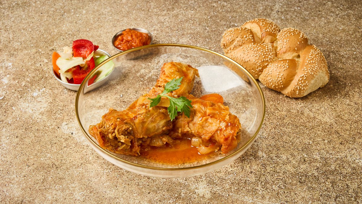 כרוב ממולא בבשר אורז וירק מוגש עם חלה מתוקה ומטבלים