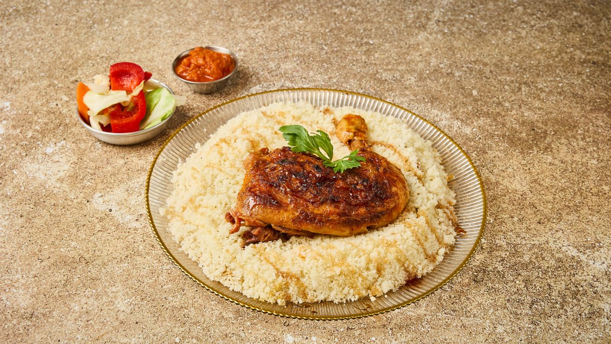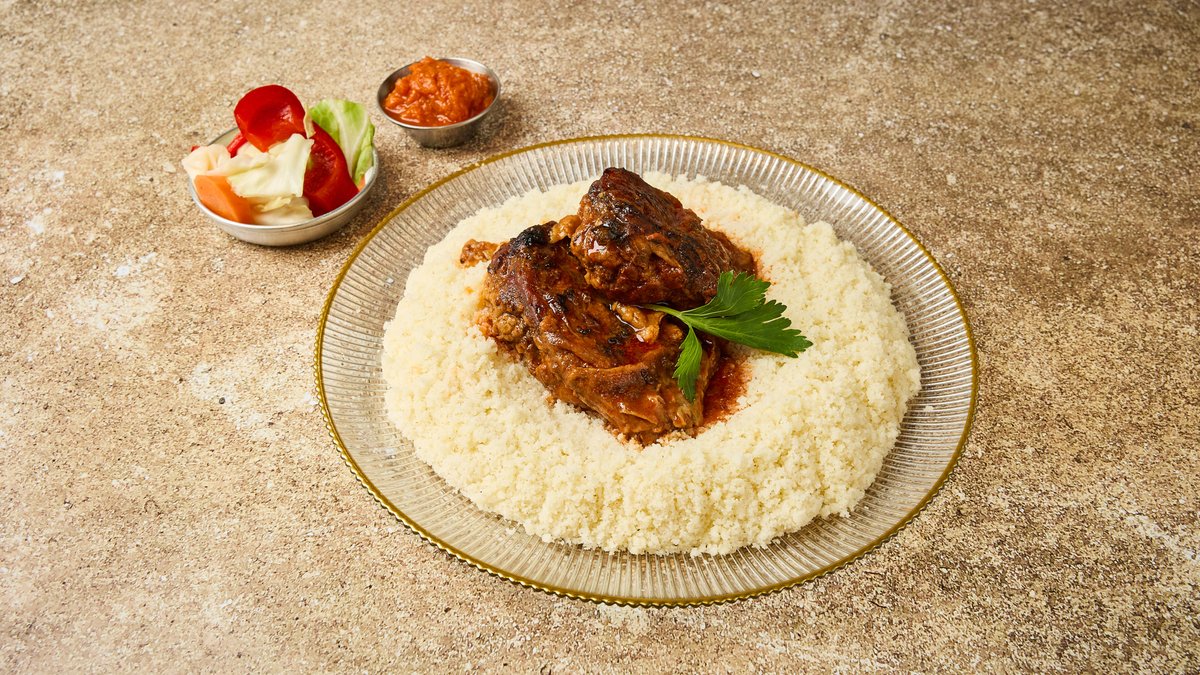 קוסקוס עם מרק ירקות מוגש עם צ׳רשי, מסייר(חמוצים) ותוספת חמה לבחירה
