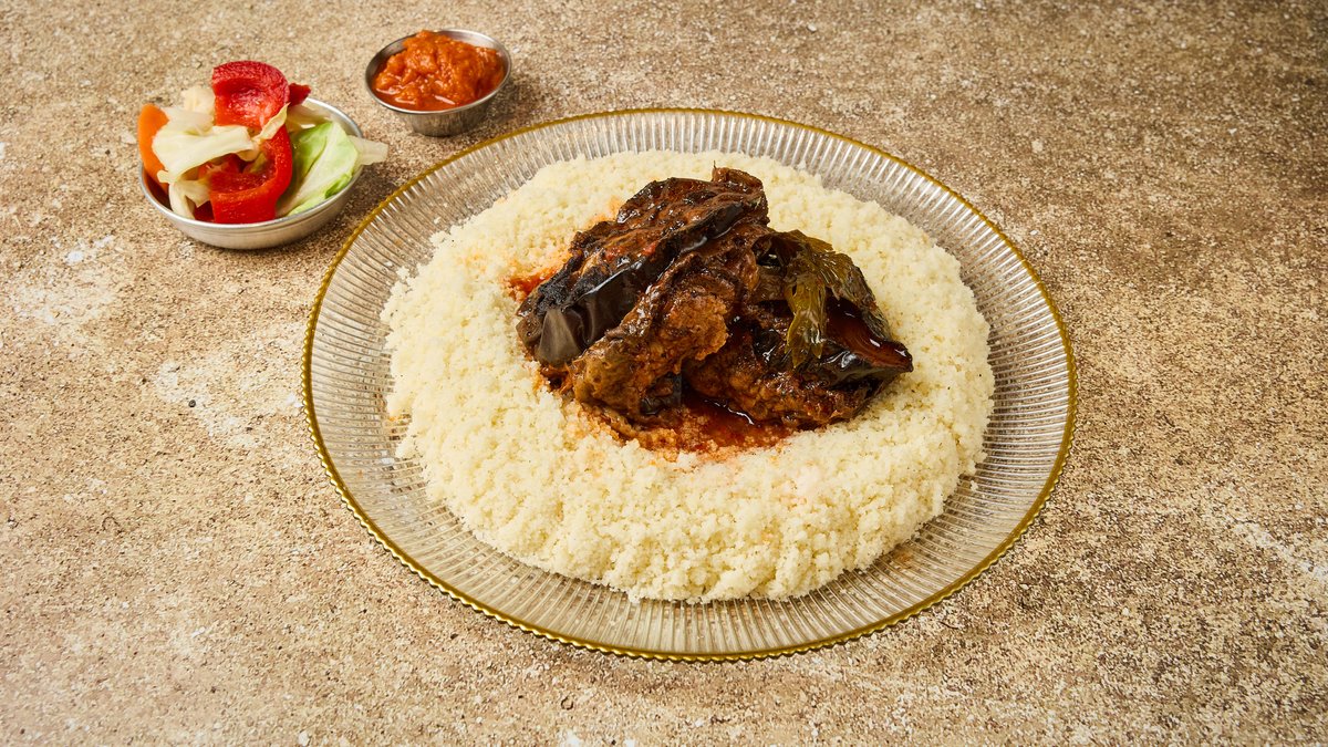 פרוסות תפוח אדמה במילוי בשר וקוסקוס מוגש עם צ׳רשי, מסייר(חמוצים) ותוספת חמה לבחירה