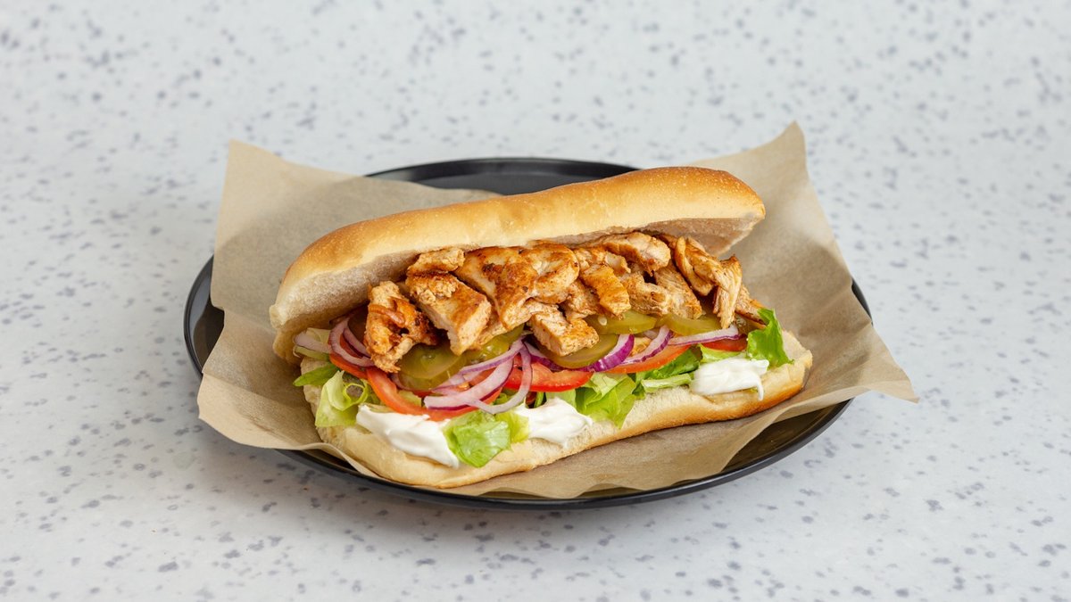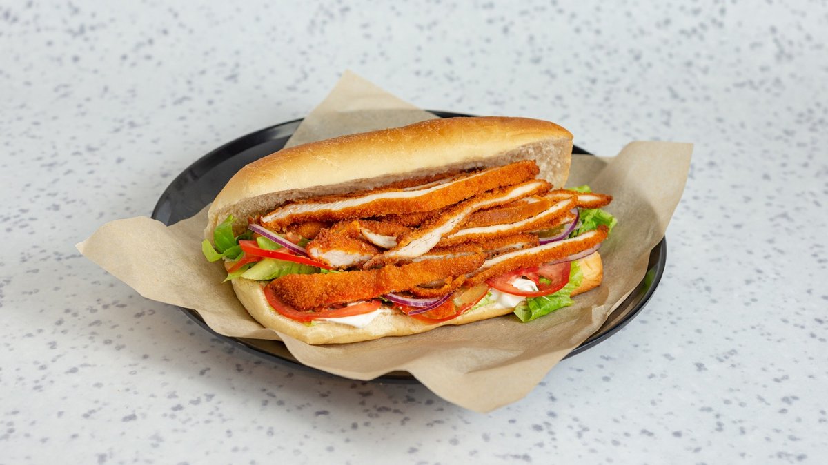 חזה עוף בתבלין סודי, מוגש עם חסה, עגבניה, בצל סגול וחמוצים. מוגש עם תוספת ושתייה לבחירה