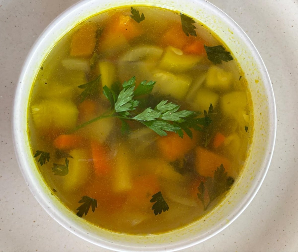 מרק עשיר בירקות: גזר, קישוא, בצל, דלעת, פטרוזיליה וסלרי עם פרוסת לחם דגנים בצד