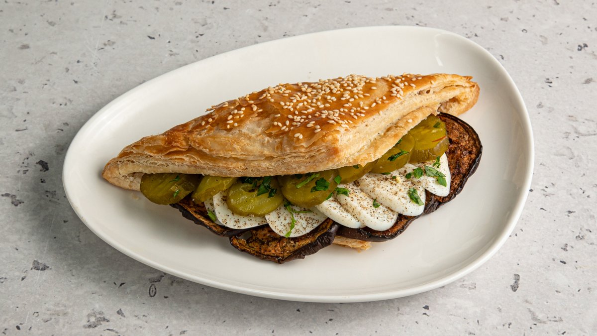 בורקס במילוי גבינה עם חציל קלוי, ביצה קשה, מלפפון חמוץ ופטרוזיליה