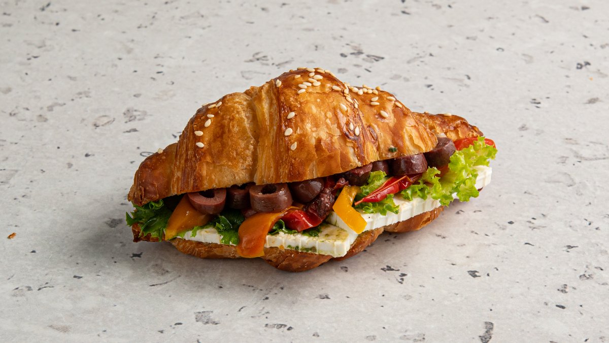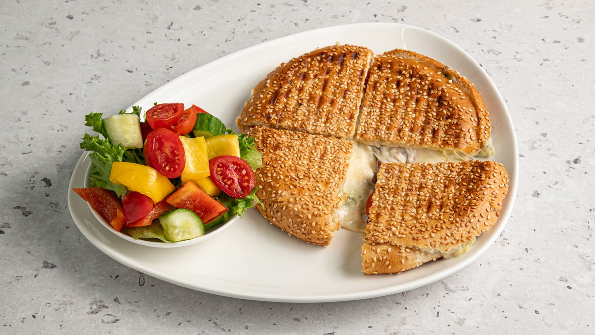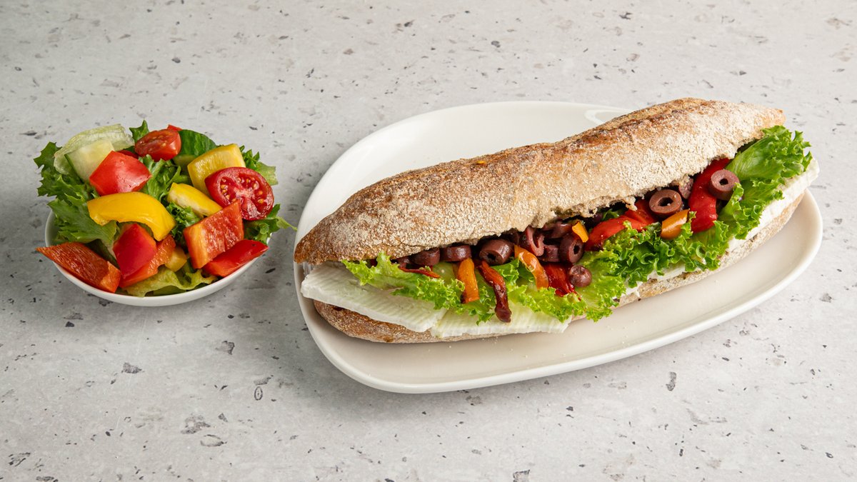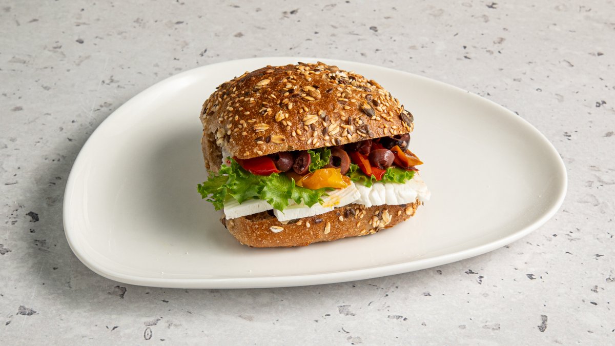 פרוסות גבינה בולגרית, ממרח פסטו, רצועות פלפל קלוי, טבעות זיתים שחורים וחסה קצוצה. מוגש בלחם לבחירה לצד סלט אישי | ללא גלוטן