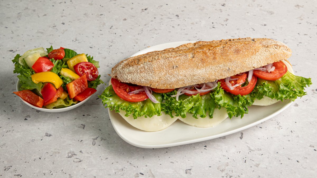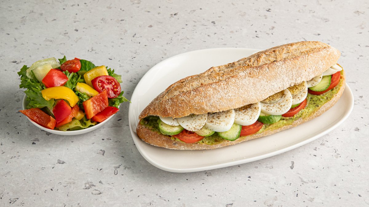 ממרח פסטו, פרוסות מוצרלה, חסה קצוצה, פרוסות עגבניה, בצל סגול, מלח גס ושמן זית. מוגש בלחם לבחירה לצד סלט אישי