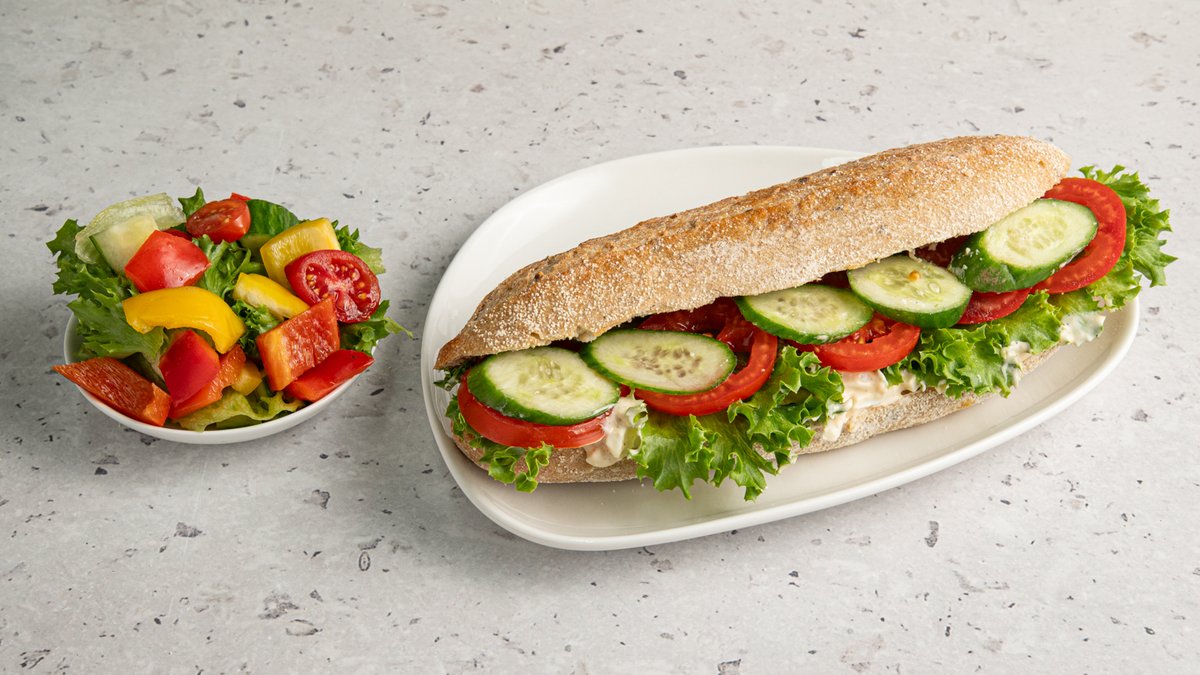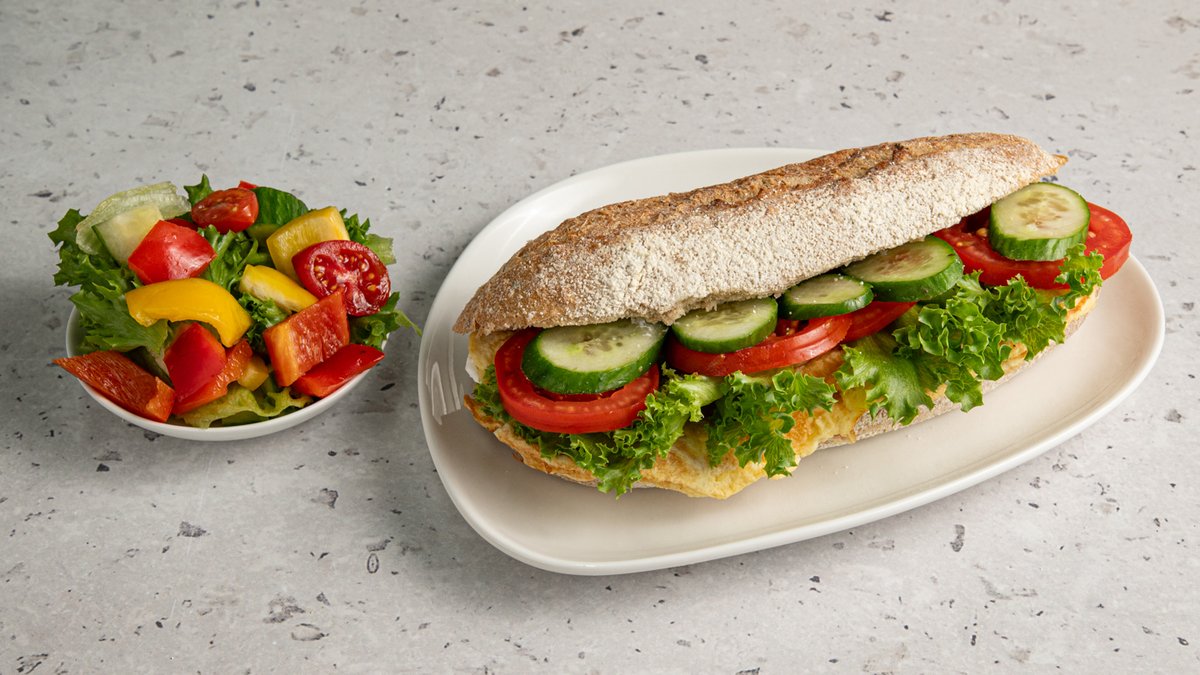 חביתת ירק, טחינה אסלית, פרוסות עגבנייה,פרוסות מלפפון חמוץ וחסה קצוצה. מוגש בלחם לבחירה לצד סלט אישי | ללא גלוטן